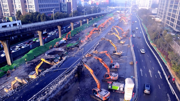 2020年12月4日22時,項目封閉施工,正式吹響大干的號角。26天后,首根墩柱順利澆筑。2月3日,30臺大型破碎機組成“鋼鐵戰(zhàn)隊”,僅用15個小時便完成了原計劃兩天才能完成的匝道拆除任務。3月25日,經(jīng)過35天的持續(xù)奮戰(zhàn),主線橋第四聯(lián)順利架設,提前拉開了上部結(jié)構(gòu)施工的序幕。