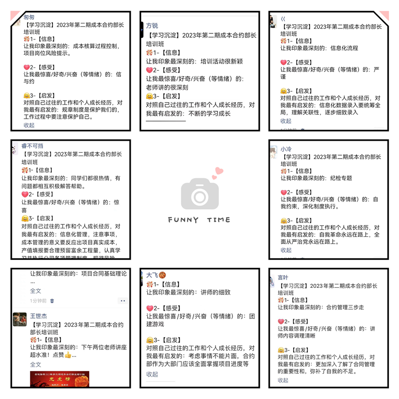 本次培訓(xùn)班課程由公司內(nèi)部培訓(xùn)師講授,課程設(shè)置方面注重以立足公司生產(chǎn)實際的真實案例進(jìn)行分析,旨在強化項目成本合約部長必備的專業(yè)技能和職業(yè)素養(yǎng),具體包括項目成本策劃、合約部信息化操作、項目合同管理法律風(fēng)險防范、合約部基礎(chǔ)管理、二次經(jīng)營、紀(jì)檢專題培訓(xùn)、情緒與壓力管理等內(nèi)容。