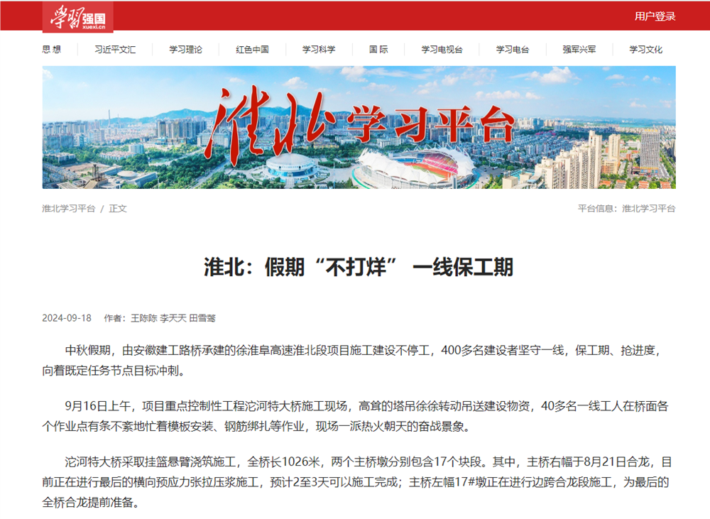中秋假期,安徽建工路橋建設(shè)者堅守崗位一線,搶抓施工“黃金期”,沖刺節(jié)點目標(biāo),跑出實干“加速度”,受到多家主流媒體聚焦報道。