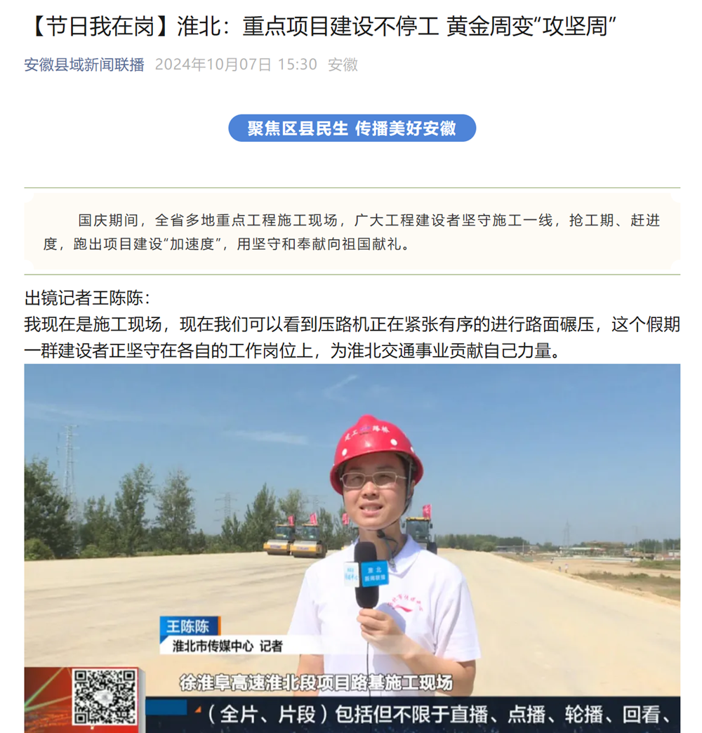 國(guó)慶前后,安徽新聞聯(lián)播、安徽日?qǐng)?bào)、江淮晨報(bào)等多家省級(jí)主流媒體紛紛聚焦公司承建的涇青高速04標(biāo)、徐淮阜高速淮北段、合肥新橋國(guó)際機(jī)場(chǎng)綜合交通中心等重點(diǎn)項(xiàng)目建設(shè)情況進(jìn)行報(bào)道。
