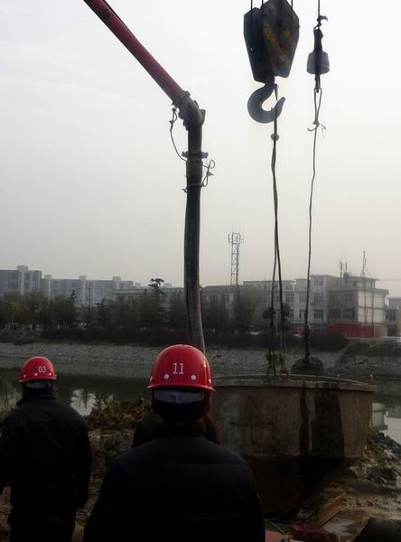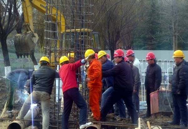 下午2時左右,鋼筋籠開始安裝。項目經(jīng)理李建成和工人一道細心的將鋼筋籠送至樁孔中。導(dǎo)管安裝完畢后,混凝土澆灌開始。到下午4時20分左右,宋斗灣路工程第一根樁澆注完畢,樁基成型。