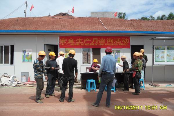 上午10時半左右,贛州高速公司安監(jiān)辦劉主任、項目辦綜合處李處長等業(yè)主單位領(lǐng)導來我標段現(xiàn)場,指導檢查安全月咨詢活動開展情況,并接受現(xiàn)場工人有關(guān)安全生產(chǎn)知識的咨詢。在對我標段安全生產(chǎn)月咨詢活動開展情況表示贊許的同時,劉主任一行也提出了要求,希望我部采取多種形式開展安全生產(chǎn)宣傳教育工作,使一線工人明確自己的權(quán)利、義務,掌握施工安全知識和技能。
