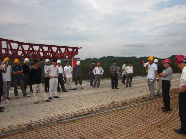 下午15:30,在大廣高速龍楊段項目辦、高駐辦相關領導帶領下,全線各高駐辦、施工單位主要負責人徒步參觀了我標江口大橋施工現場。實地考察中,我標項目經理羅權針對水混凝土橋面鋪裝施工情況作了簡要介紹,并就部分施工細節(jié)問題與觀摩團進行了深入交流。